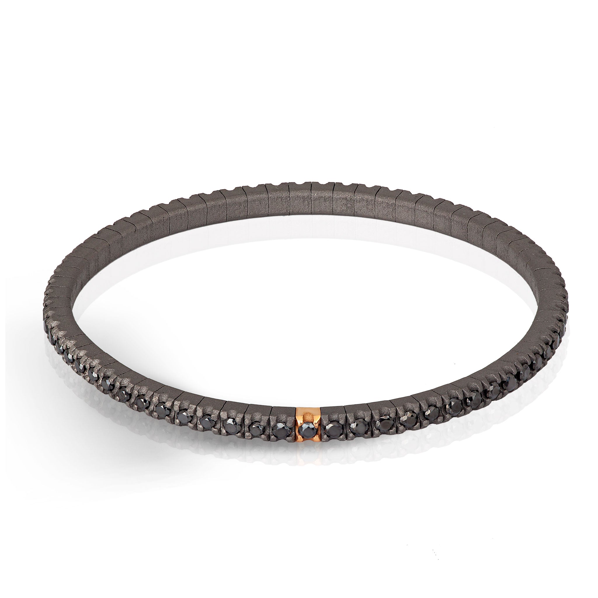 Taglia M.Bracciale uomo Linea Loop in titanio e diamanti black (ct. 3.30). La struttura รจ composta da una fila ininterrotta di diamanti da 5 punti incastonati su griffes in titanio e una in oro rosso da 18 Kt poste una accanto all’altra su una maglia elastica. In questo bracciale si racchiude l’idea del classico gioiello tennis con l’innovazione del materiale che lo rende leggero, sicuro e facile da indossare.