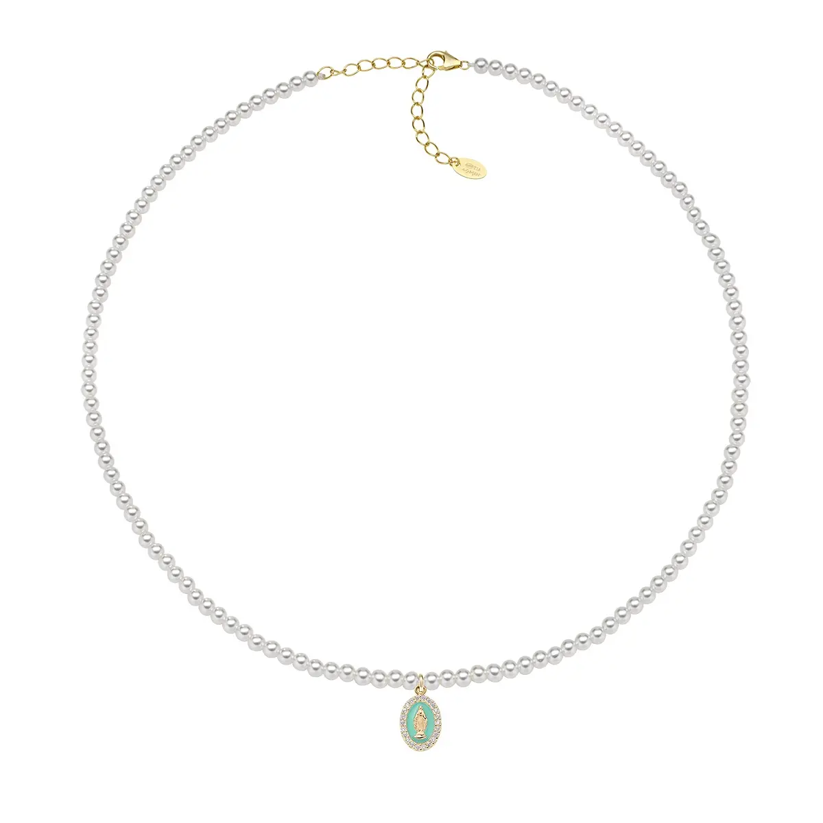 Collana in argento 925 dorato con perle di cristallo e piccola medaglia raffigurante la Madonna Miracolosa su sfondo smaltato verde mare con bordo di zirconi bianchi. Un delicato simbolo di protezione impreziosito da perle e zirconi, da indossare tutti i giorni.