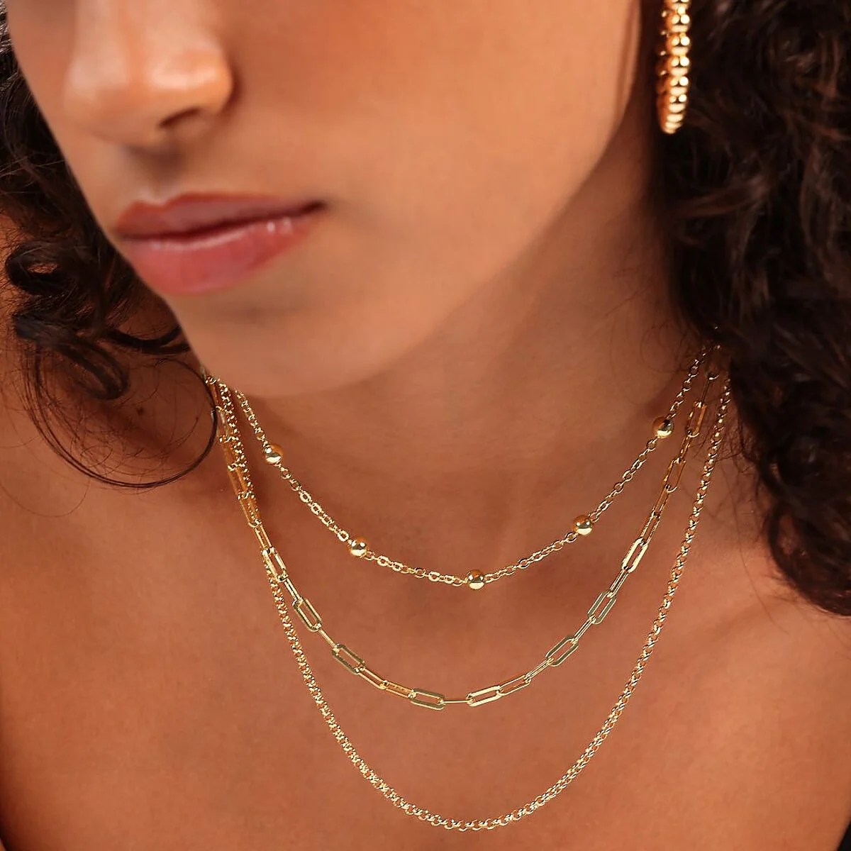 Collana multi-filo Etrusca Gioielli realizzata in lega Golden, placcata Oro giallo 18kt, composta da tre fili: collana più corta con bead lucide (42 cm); collana intermedia con maglie ovali allungate (47 cm); collana più lunga con catena rolo classica (50 cm). Chiusura a moschettone complessiva. Ogni collana ha la propria chiusura che permette di indossarle singolarmente.
