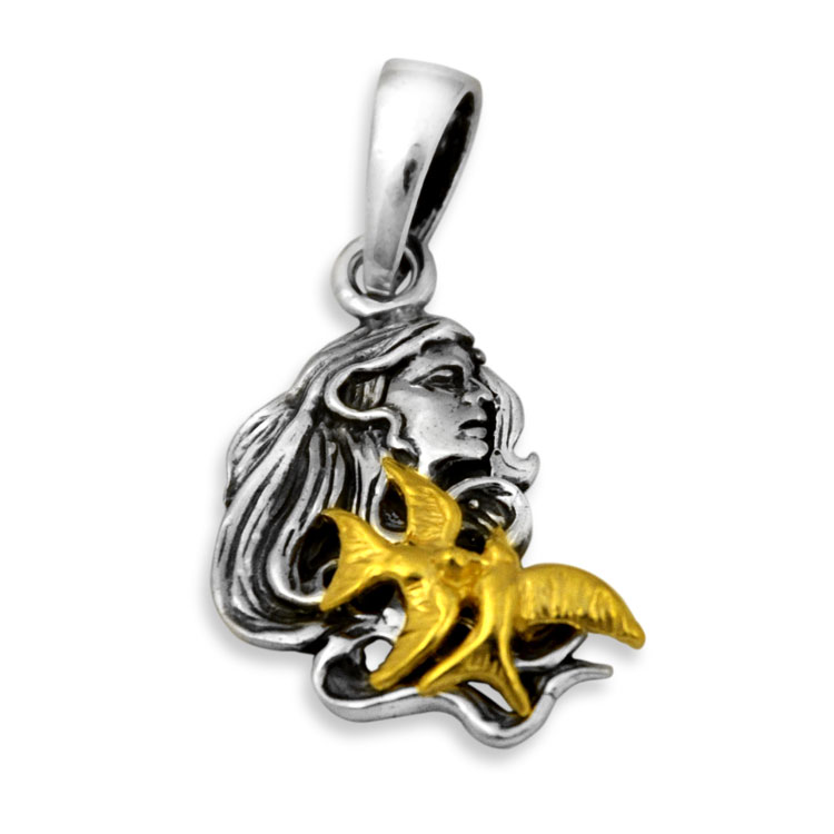 Pendente Marzo in Argento 925/000 con volto di Venere cesellato a mano e simbolo del mese, le rondini, in argento dorato. Un accessorio perfetto per ogni occasione, un gioiello che parla di te!